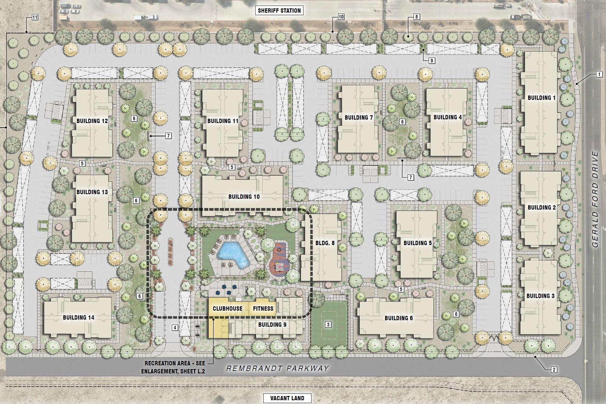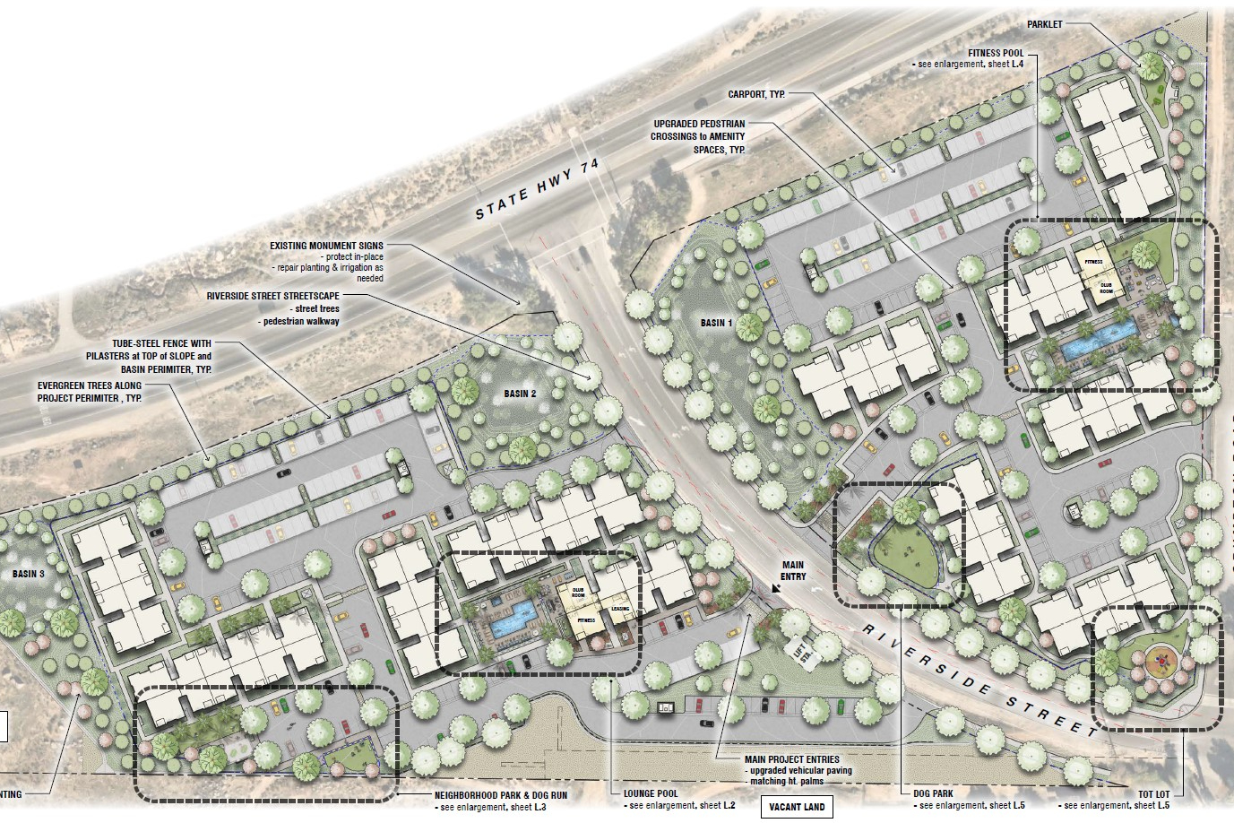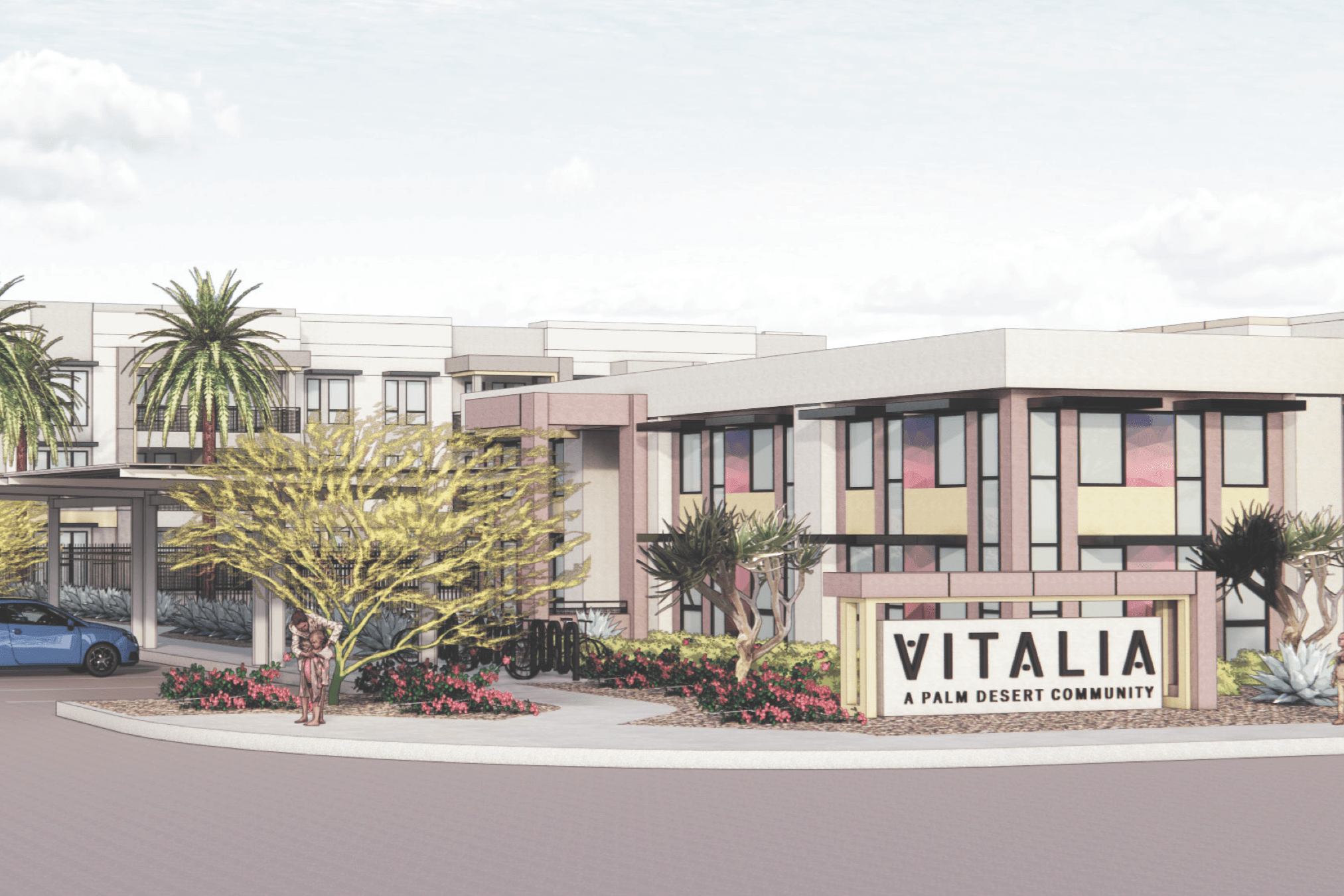VITALIA APARTMENTS is a 270 unit 100% affordable housing development featuring 2 and 3-story walkup products in Palm Desert, California. An amenity core with dog park, swimming pool, shaded picnic area and children’s play area is connected to the community with landscaped pedestrian paseos. Plant material and site design has been selected to respond to desert climates and conditions.