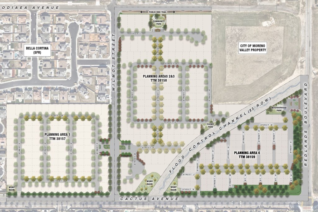 BELAGO PARK is an a master-planned residential community consisting of approximately 300 for-sale homes in Moreno Valley. The community includes small-lot product as well as traditional homes linked together with site-wide pedestrian connections and three community parks. A Class I public bike trail to the north is part of a regional network of trails connecting the site to the greater area.