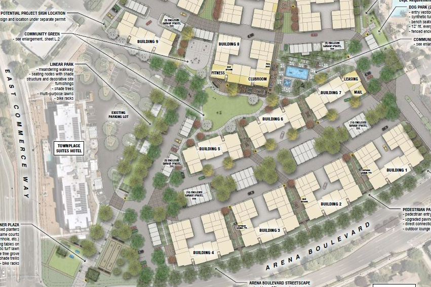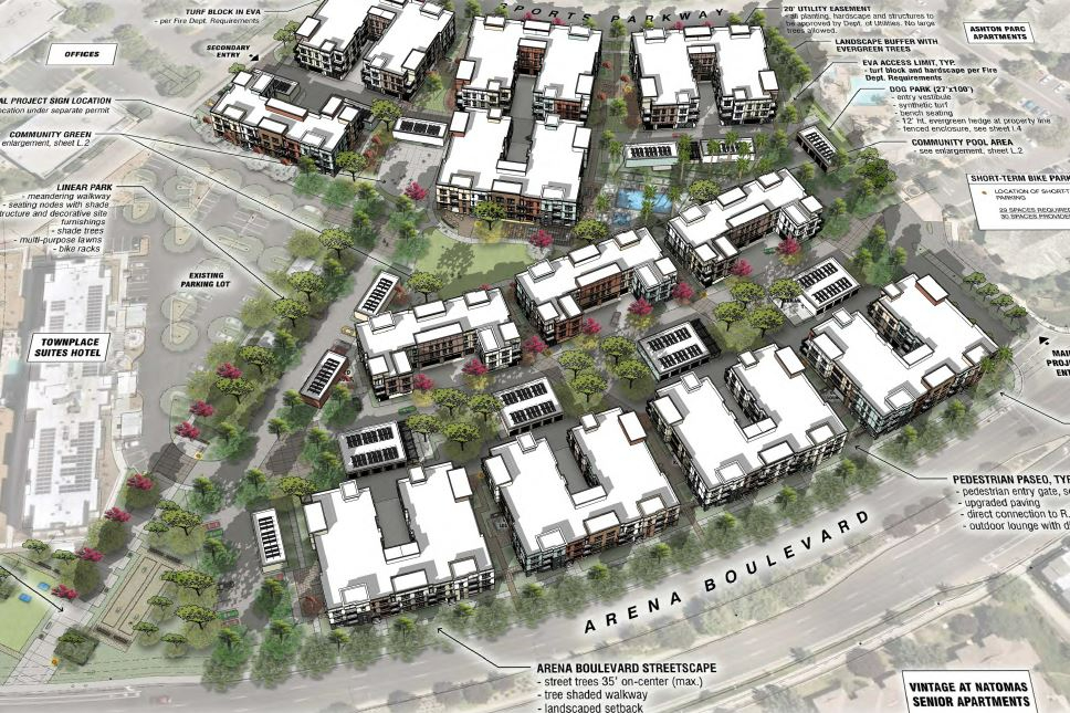 ARENA BROWNSTONE brings 282 condo-apartments to Natomas, Sacramento. A brownstone architectural vernacular is reflected in this amenity-rich community which includes a dog park, pool, spa, pickleball court, landscaped paseos and community park. Active, healthy living is encouraged with the integration of sports courts, site-wide bicycle amenities and a number of outdoor game and lounge spaces.
