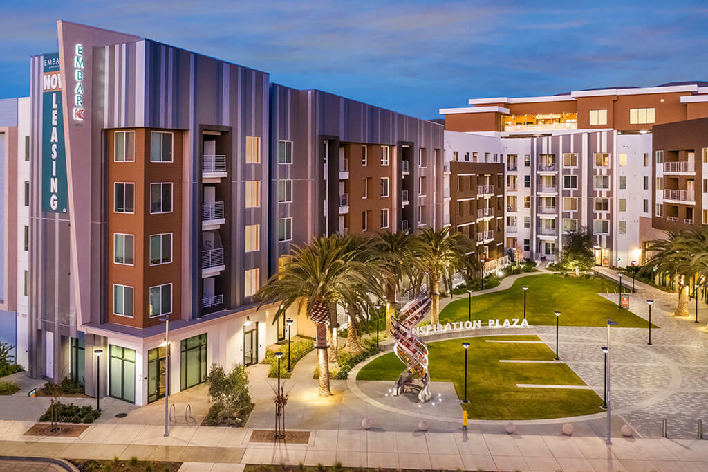 EMBARK APARTMENTS integrates Civic spaces into the fabric of a community. Located in Fremont, CA and the home of a newly minted Tesla manufacturing facility it’s ideally positioned to support the new workers coming to the area while also providing much needed affordable housing. “Inspiration Plaza” is a public park at the heart of the community that will be utilized for food trucks, concerts and festivals to promote sense of community.