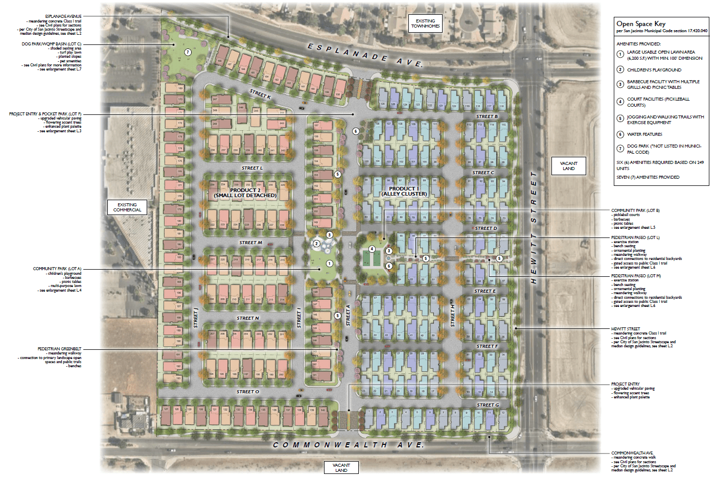 ESPLANADE COLLECTION is a small-lot and alley cluster community of 249 detached single-family homes in San Jacinto, CA. Two central parks are connected to the community via through-block trails and paseos. The palm-lined parks include pickleball courts, a large children’s playground, shaded barbecue areas, water features and multi-use lawns.